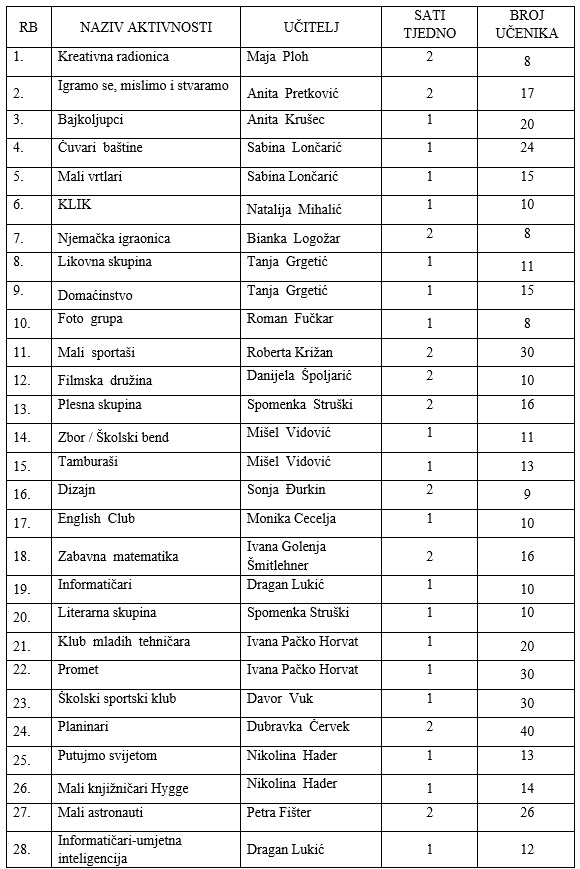 Program izvannastavnih aktivnosti (B1) sastavni je dio školskoga kurikuluma unutar Eksperimentalnog programa. Organizira se i izvodi u funkciji nacionalnoga kurikuluma kroz zadovoljenje potreba i interesa učenika, kao i kroz prilagodbu odgojno-obrazovnog rada pojedinim odgojno-obrazovnim skupinama učenika. Sudjelovanje učenika i učitelja u Programu izvannastavnih aktivnosti izborno je, ne uključuje vrednovanje i ocjenjivanje, a za učenike je besplatno.