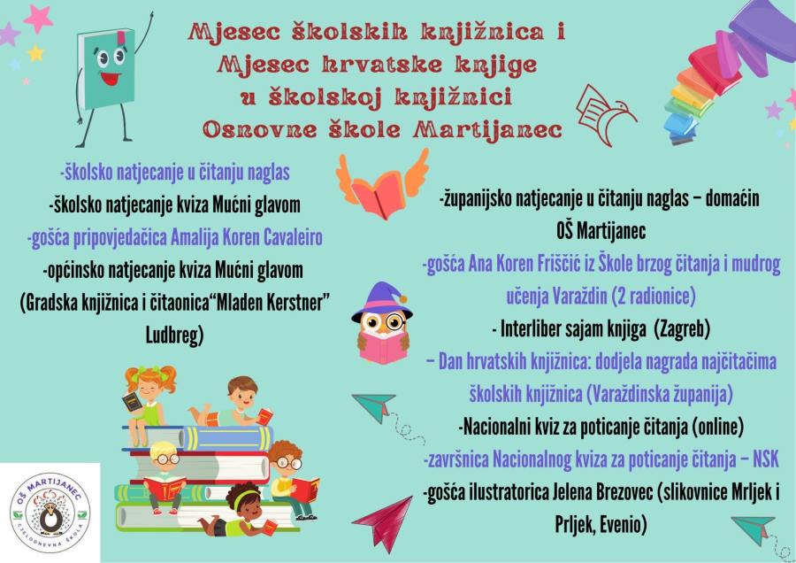Tijekom listopada i studenoga u školi i školskoj knjižnici obilježene su manifestacije Mjesec školskih knjižnica i Mjesec hrvatske knjige. Za učenike je pripremljen raznolik program kojim se promicala ljubav prema čitanju i knjizi. Aktivnosti je organizirala školska knjižničarka Nikolina Hader. Našu su školu tom prilikom posjetili brojni gosti – pripovjedačica, ilustratorica te voditeljica škole brzog čitanja. Osim toga, i mi smo posjetili mnoge kulturne ustanove koje su, baš poput nas, obilježavale Mjesec hrvatske knjige. Bili smo u Gradskoj knjižnici i čitaonici „Mladen Kerstner“ u Ludbregu, Nacionalnoj i sveučilišnoj knjižnici u Zagrebu, na sajmu knjiga Interliber u Zagrebu te u palači Varaždinske županije u Varaždinu.